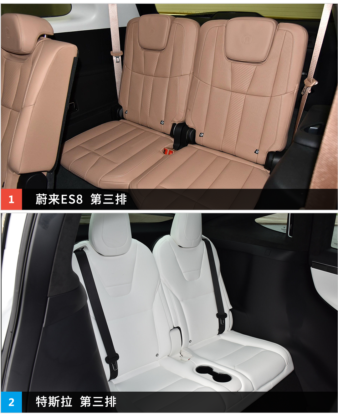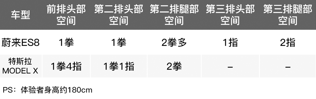 而坐在特斯拉MODEL X前排时,头部空间为1拳4指,即使在第二排座椅上也能有1拳1指的头部空间和约2拳的腿部空间,足够宽敞。不过第三排座椅的乘坐空间就要逊色于蔚来ES8,不但腿部会顶住第二排座椅的靠背,而且头部都快靠着后车窗玻璃了。