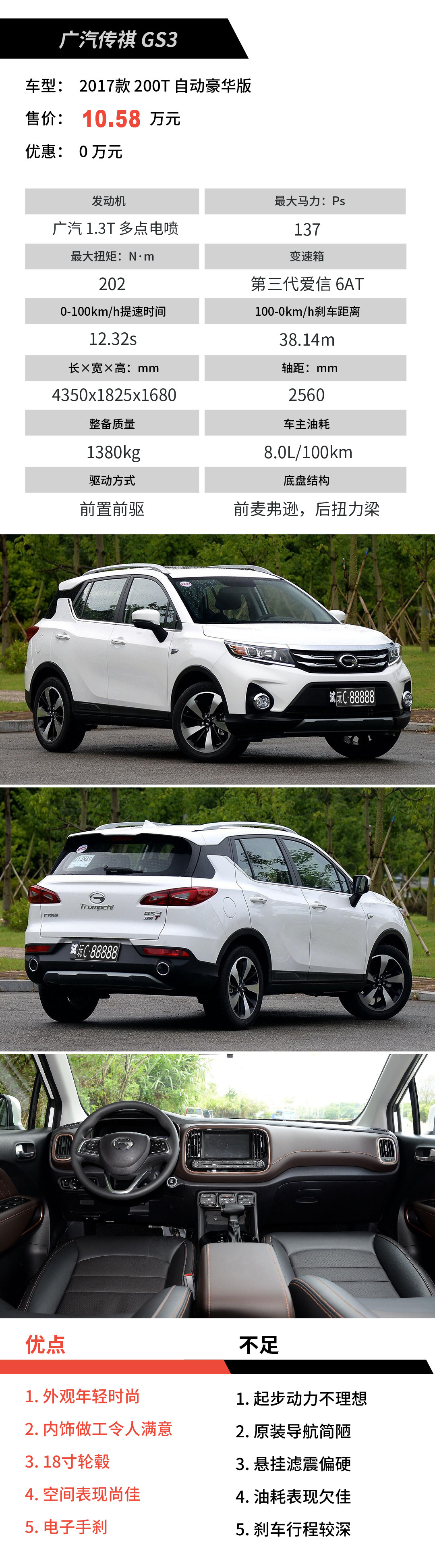 酷似GS4的原创外观相当讨喜,1.3T的动力说不上给劲,好在爱信的6AT换挡足够平顺积极;尽管底盘滤震表现还待提升,但18寸的米其林浩锐3st亦能为其加分不少。不过讲真,GS3和GS4,GS7和GS8是不是传祺学大众套路的体现?