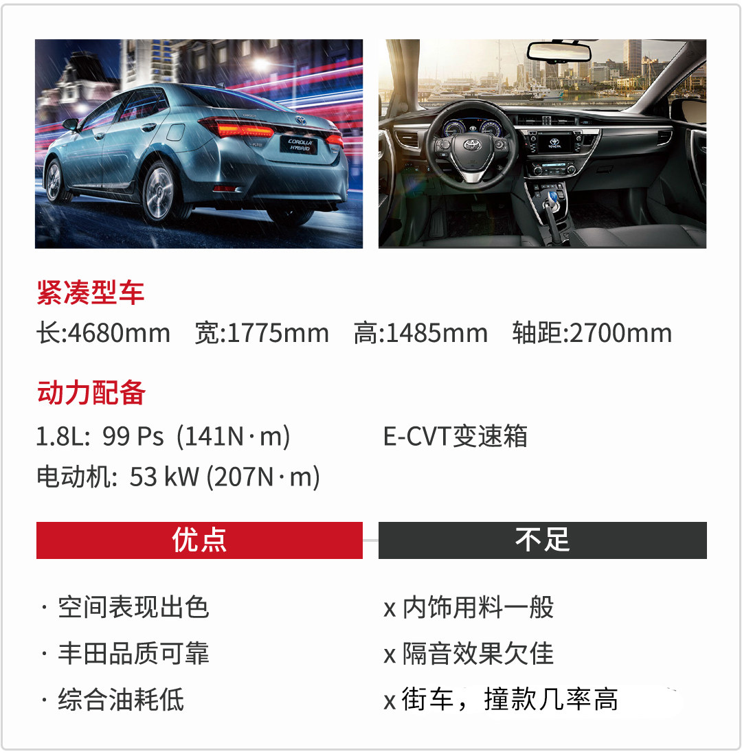 卡罗拉混动车型使用的是丰田THS-II系统,由一台1.8L 阿特金森发动机和双电机组成。除了低速情况下纯电驱动,大多时候都是混合动力驱动,其主要通过行星齿轮等技术,让发动机和电机根据车速、路况、加速需要自动切换组合动力源,从而达到最大燃油效益。