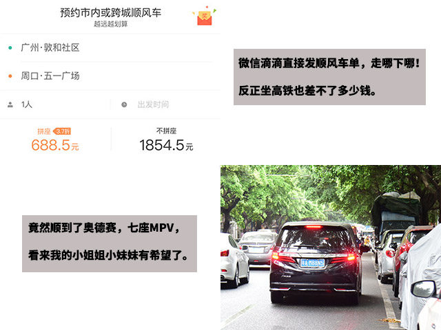 对于一个单身狗来说,小姐姐小妹妹的吸引力是无比巨大的,而拼车正正对上了这货的胃口,因为男女拼车的几率是非常高的。直接微信滴滴发布行程,然后等着车主接单就可以了。(这里get给大家一个技能:跟车主大哥事先谈好价钱后上车面交,至于为什么?嘿嘿,你懂得!)