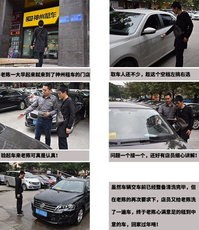 现在这种实体租车也直接采用了APP下单,到点验车取车的方式。老陈刚到店,店员就直接带他去车场选车了,老陈这人就是挑剔,选来选去之后挑了一台中意的黑色朗逸,随后店员非常细心的带老陈验车,这店员真有耐心,特别是面对老陈一波接一波的问题,他都能一一细答。临走前,老陈还不忘坑人家一顿洗车。