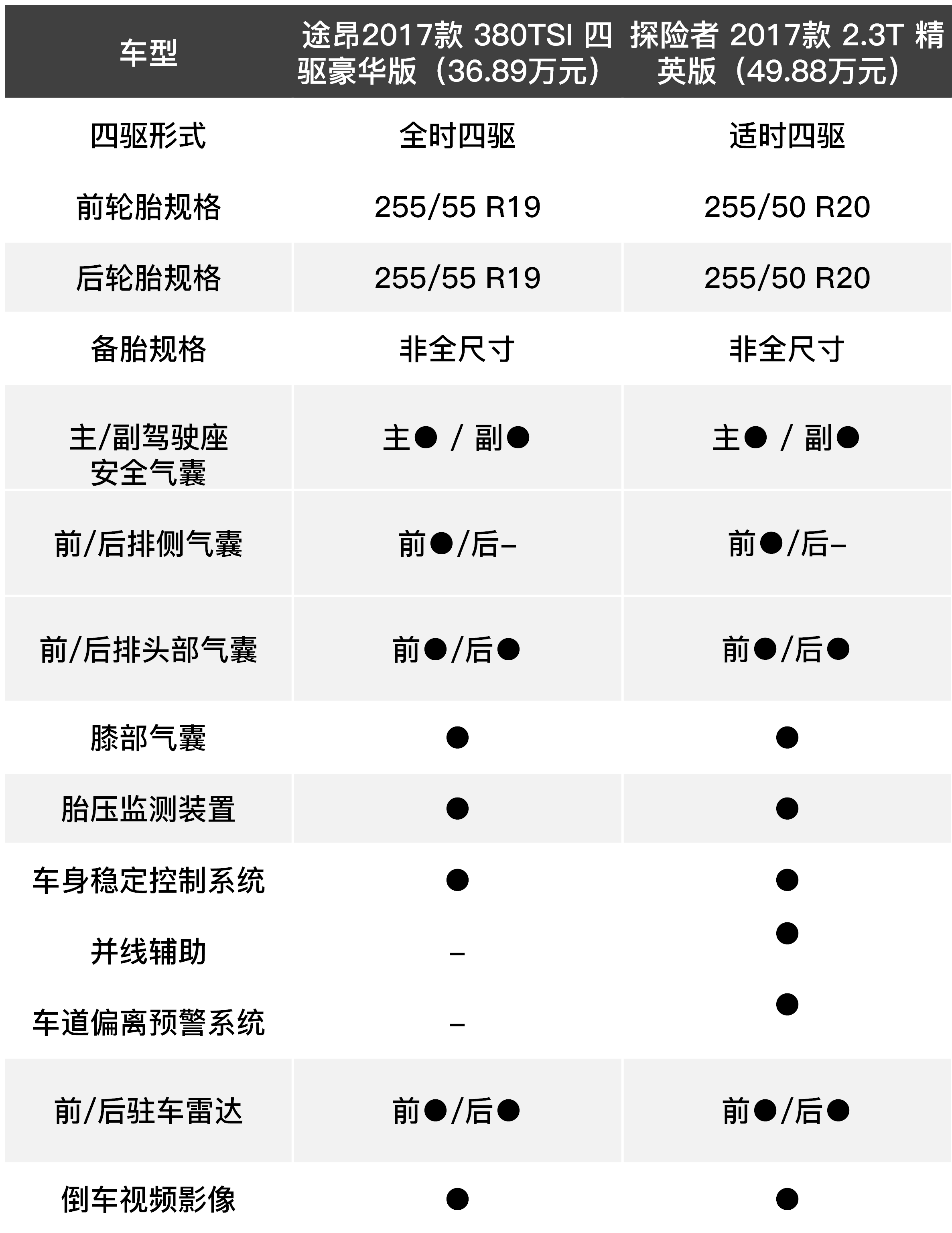 虽然挑的这两款配置车型在售价上完全不是一个级别,但这两个配置是各自车系里面最为热销的版本,所以还是有比较大的代表性。从图上可以看出,其实两者的配置都比较充足,实用性也很强,不过总体而言探险者在行车辅助安全配置以及舒适性配置方面还是更胜一筹,但考虑到价格上的差异,配置更丰富也是很合理的。