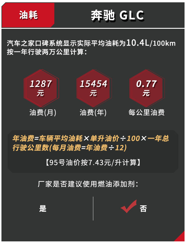 油耗方面GLC平均油耗在10.4L左右,算是不错,按照教授落笔日这边广东的油价,95号油7.43元,GLC每公里油耗8毛不到。