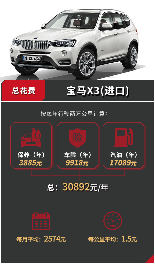 小结:对比的X3同样是现款,同样选取较多人购买的xDrive20i X设计套件,保养花费也是挺省心的,按照官方1万公里间隔,平均一年4千不到,但是同样在油耗上面吃了亏,2.0T车型的平均油耗达到了11.5L,而且同样的保险费用高出了一截,比起GLC依然差一口气,换代车型还需要一段时间才上市,现在出手选择GLC会更明智。