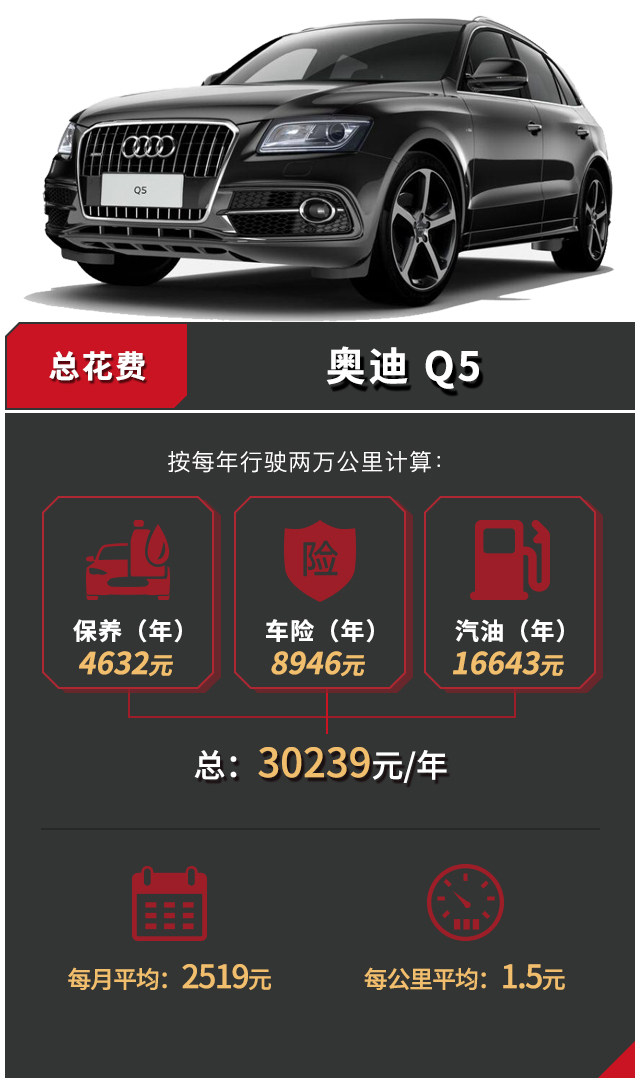 小结:Q5是销量最高的豪华SUV,对比的信息是现款车型,拿较多人购买的40TFSI技术型作对比,平均油耗达到11.2升,油费就比GLC高出一截,全系四驱使油耗吃了一点亏,按照官方保养周期一年也在1万4左右(如果实际4S点建议的5千公里一保会高出非常多),总体来说不相上下,不过新款车型即将上市,建议有意购买的朋友观望一下。