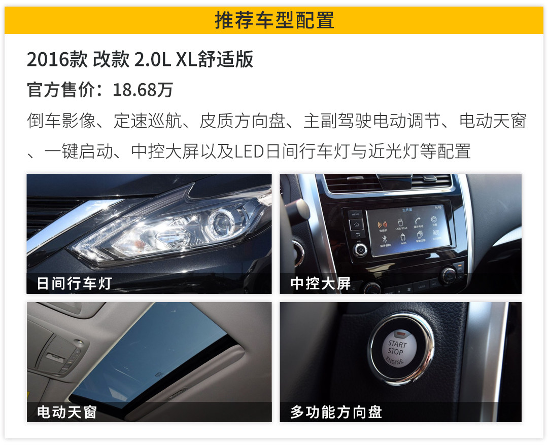 由于市场上动辄有两三万的市场优惠,目前天籁最值得购买的车型当属次低配车型改款2.0L XL舒适版。相较于乞丐版,它多了倒车影像、定速巡航、皮质方向盘、主副驾驶电动调节、中控大屏以及LED日间行车灯与近光灯,日常使用更便捷。正因如此,如果你的预算不多,想一步到位购买一款中型车的话,那么天籁的这个版本一定是你最好的选择。