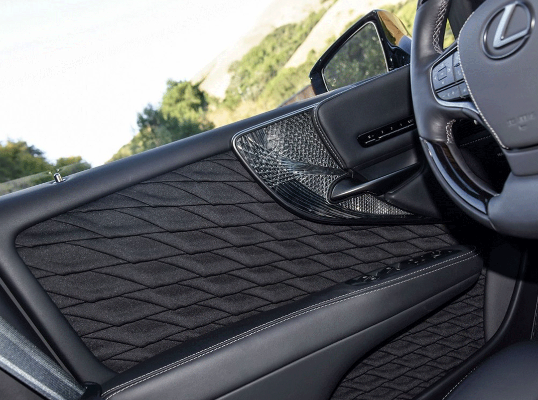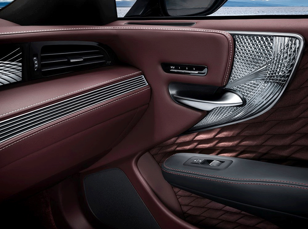车门内衬可以选择经由日本传统“切子”玻璃加工工艺大师处理的玻璃工艺品装饰。而车门内衬则提供了多重褶皱的装饰,营造出层次感出色的视觉效果,而且比一般的二维设计更多出一维美感。