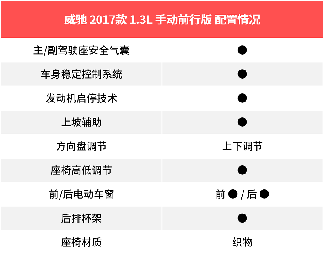 售价不超7万的低配版威驰,为什么值得买?因为相对同级车型来说,它是比较注重安全的一款小型车,连低配车型都有车身稳定控制系统、上坡辅助等配置。而且它还是一款舒适的代步小车,乘坐空间相对宽敞,尽管只是织物座椅,但座椅的柔软度、厚实度都不错。