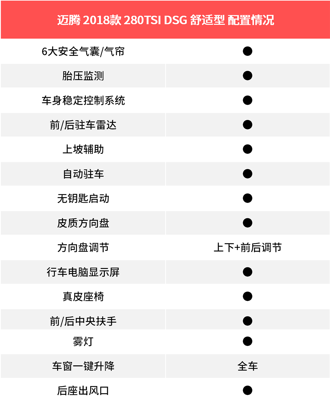 低配版车型的变速箱与顶配一样都是7DCT变速箱;安全配置有着中配车型的水平;皮质方向盘、方向盘四向调节、真皮座椅、全车车窗一键升降等待遇都是与顶配一样的。这样看来,低配版的迈腾已经很够用了。