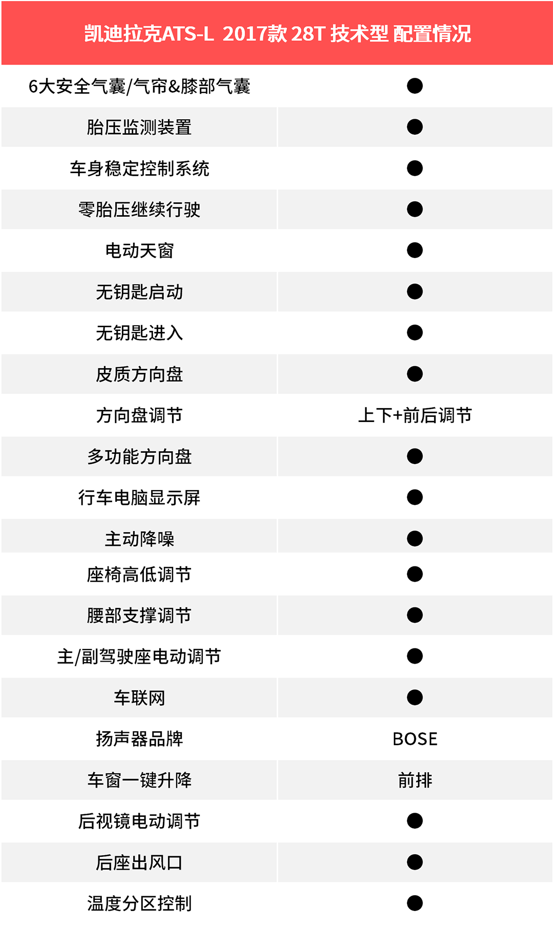 如果你是一个追求速度与激情的人,一姐向你推荐凯迪拉克ATS-L。它作为一款中型车,本身的定价定位都不低,就算是低配版也不用担心它的配置拿不出手。车身稳定控制系统、零胎压继续行驶、电动天窗、多功能方向盘、腰部支撑调节、主/副驾驶座电动调节、BOSE牌音响等低配车型都有。