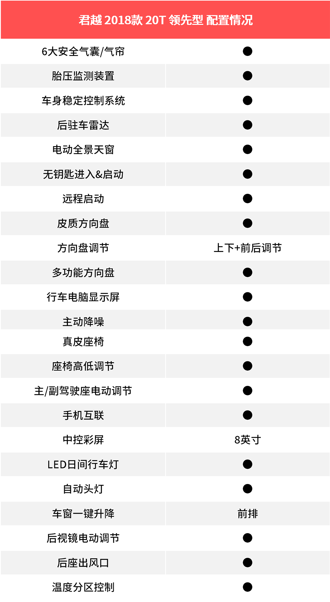 别克品牌擅长打造豪华感十足的内饰,而旗下定位最高的中型轿车——君越更是内饰用料奢华,并且配置丰富。电动全景天窗、远程启动、四向调节的多功能方向盘、真皮座椅、行车电脑显示屏、LED日间行车灯、手机互联等配置在低配版车型就有出现。