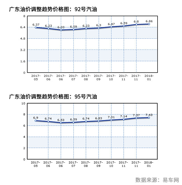 以广东与北京的汽油价格为例,图表中横轴部分有些月份相同,反映了该月调整油价的次数,比如广东油价2017年6月第一次调整为6.74元/升,第二次调整为6.53元/升。