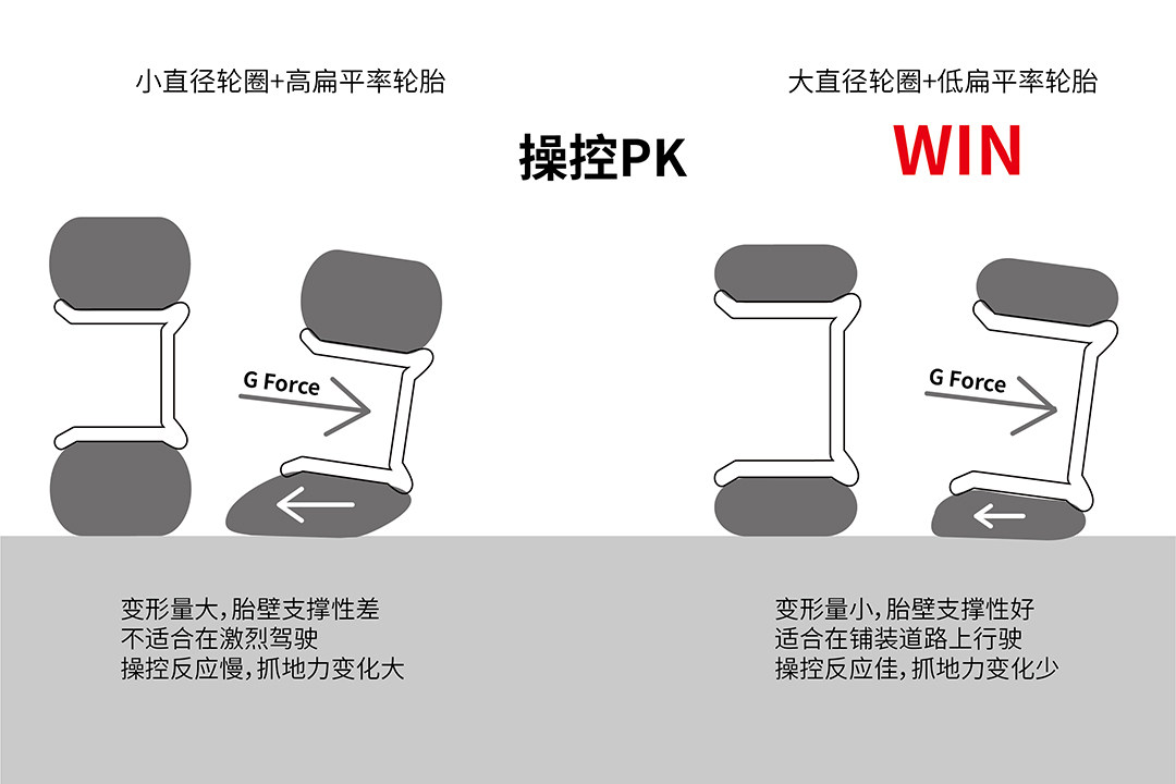 通常转弯的时候,轮胎先经过横向拉力变形,再拉动车辆改变行进轨迹。一般来说过弯时,轮胎扁平率越大,变形量也就越大,所需要的时间也就越久,同时抓地力的变化也越大,反应到操控上就是操控变得更迟钝。相反,扁平率更低更薄的轮胎,由于可以变形的量更小一些,因此相对于扁平率大的轮胎操控反应会更快。