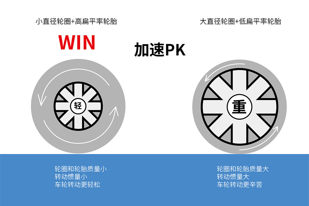 汽车加速时,动力除了用于推动车身前进以外,还有一部分动力用于转动车轮。由于车轮本身是有质量的,要将车轮转动起来也需要耗费一定的动力。轮胎重量越大,浪费在转动车轮上的动力越多,用于推动车身加速的动力也就越少。一般来说,即使外径一样,大直径金属轮圈配低扁平率轮胎的总重量比小直径轮圈配高扁平率车胎的组合要更重一些,因此反应在加速反应上,小轮圈的加速反应也会表现更好。