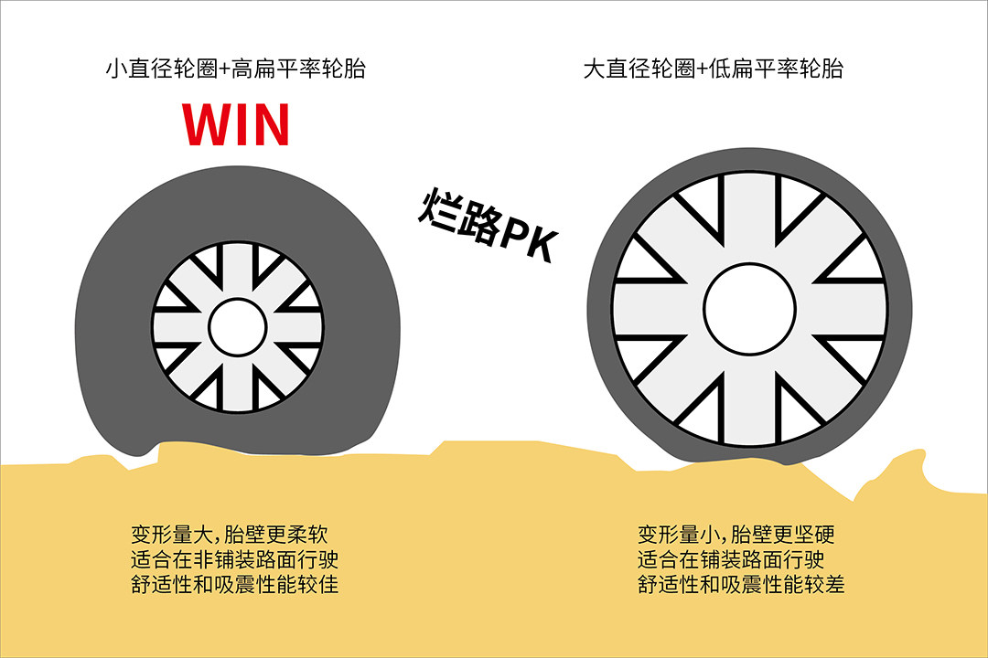 小直径的轮圈会配上扁平率更大的轮胎,直观来说就是轮胎更厚了。一般来说轮胎属于弹性部件,轮胎更厚受外力变形会更容易。因此一些路面的小颠簸和小震荡吸收会更好。而大轮圈使用扁平率更小胎体更薄的轮胎,吸震效果并不如较“厚”的轮胎。因此小直径的轮圈会更舒适。