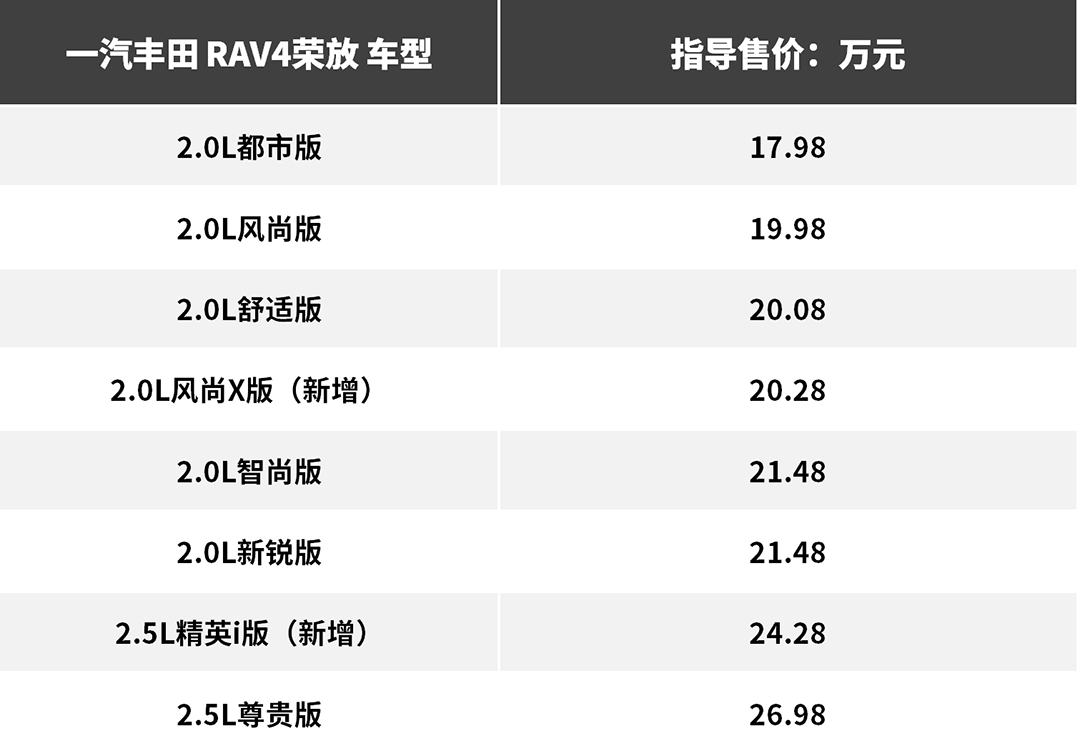 一汽丰田RAV4荣放在保留固有优势的前提下,对产品序列进行补充和升级,新推出2.0L风尚X版、2.5L 精英i版,并对2.5L全系车型搭载Toyota Safety Sense(智行安全-丰田规避碰撞辅助套装),新款车型售价分别为20.28万元、24.28万元。