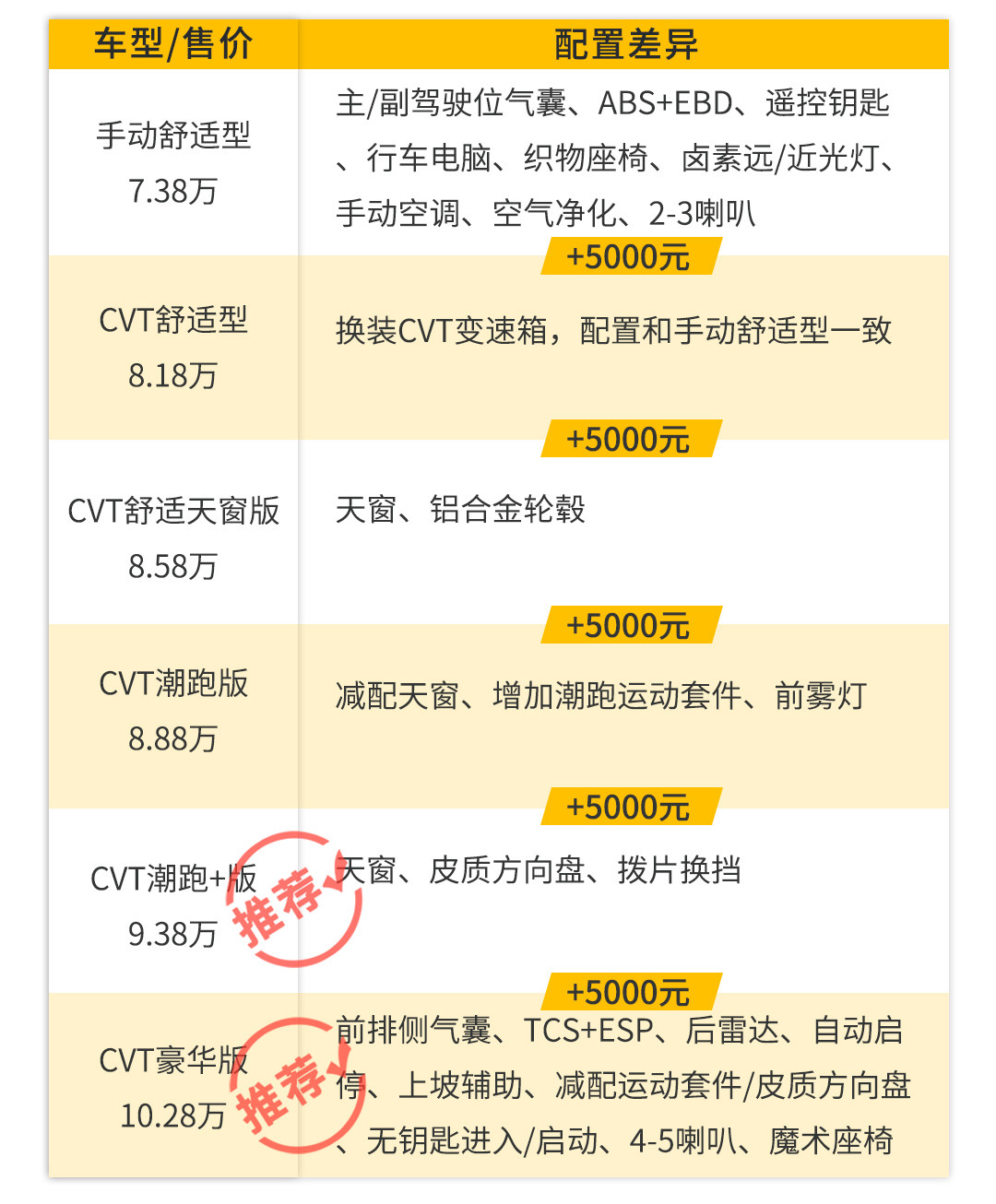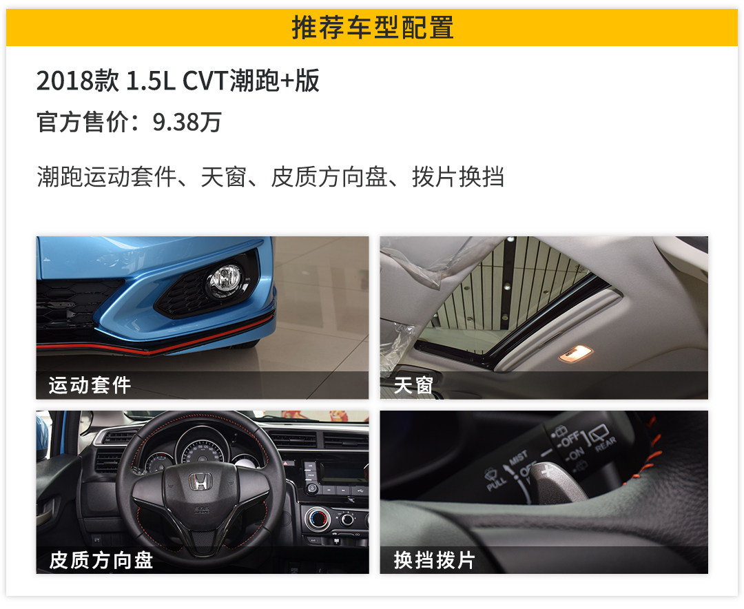 飞度这次改款普通车型并无多大变化,整体配置高度都是比较低的,与其说是推荐,不如说是看点吧,潮跑和潮跑+版,潮跑版的配置只比CVT舒适版多出铝合金轮圈、运动套件和前雾灯,价格就贵出7千块钱,性价比似乎一般般呐;而潮跑+版独占了皮质方向盘和拨片换挡,再加上天窗,盛惠5000大元,这两款车型应该适合不太喜欢自己动手改车的消费者,现成而且原厂更有质量保证。