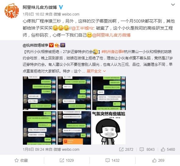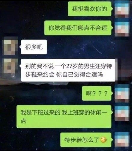 近日,微博上一张聊天记录火了,一个程序员因为穿着特步运动鞋去相亲,被女方嫌弃了。