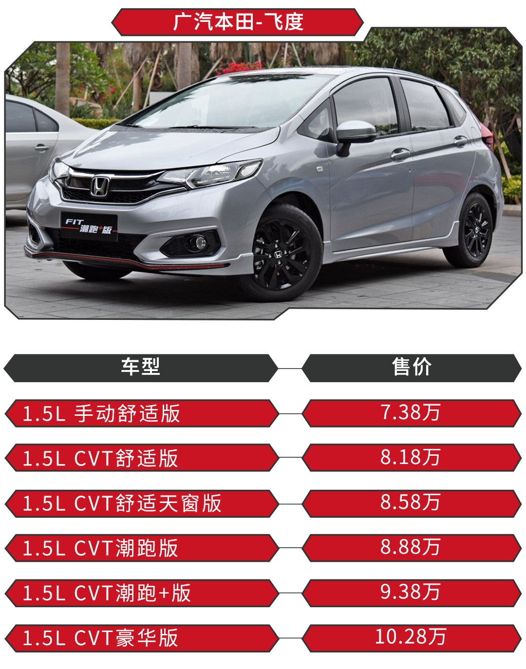 日前,2018款飞度正式上市。新车作为中期改款车型,共推出搭载1.5L发动机的6款车,其中有两款车型,正式被官方定位为“超(潮)跑”,新车的售价区间为7.38-10.28万元,6款车型怎么选?虎哥来帮你。