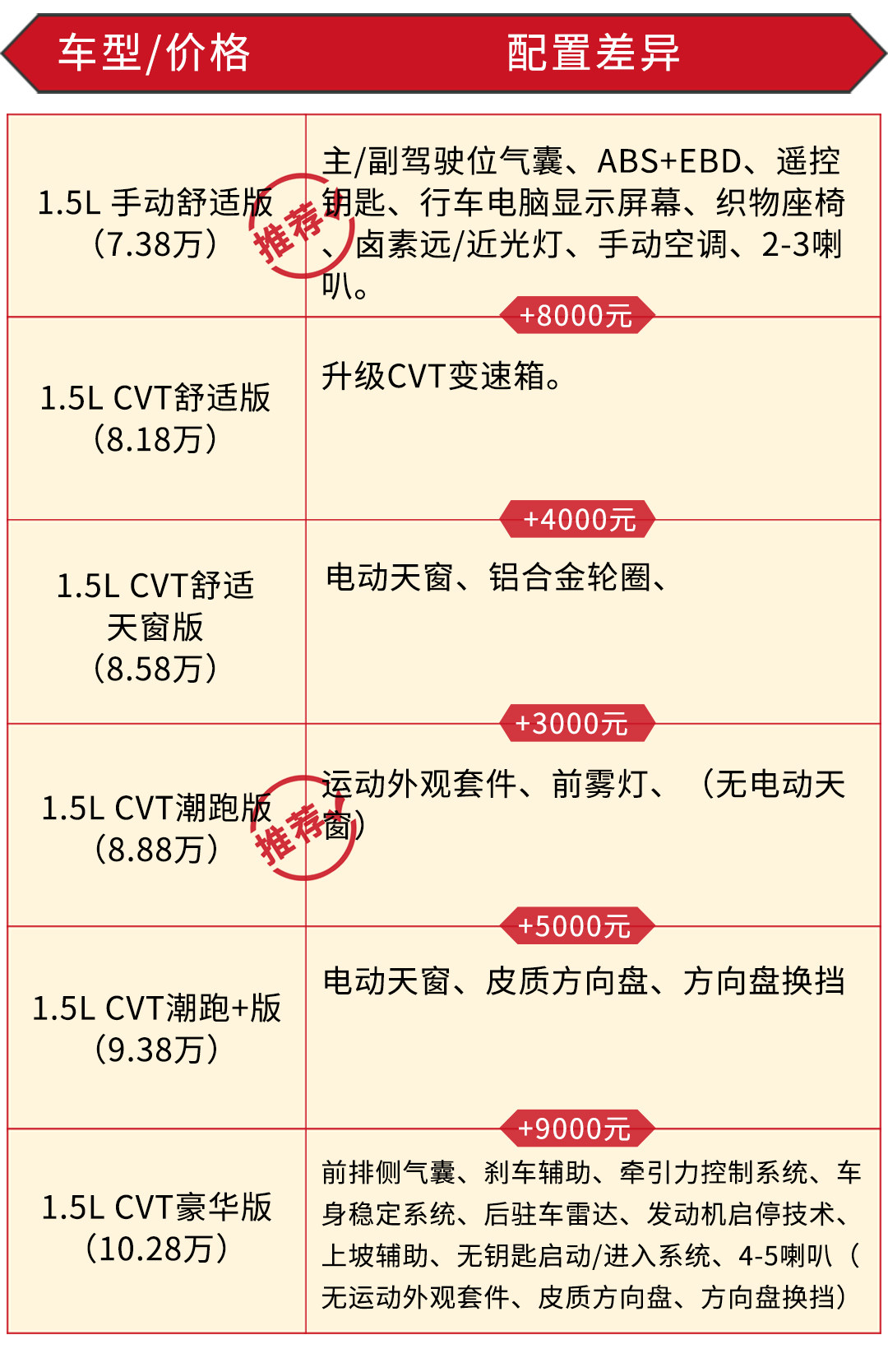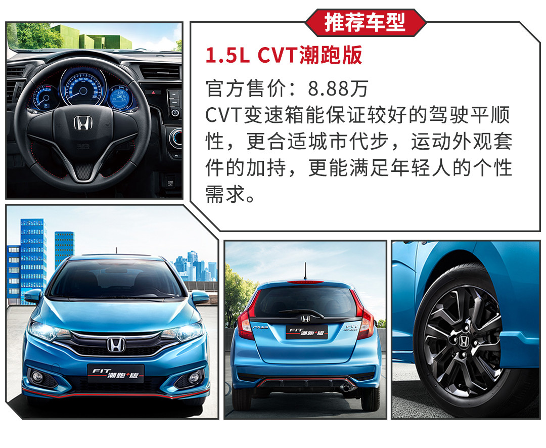 主要推荐两款车型,第一肯定是唯一的手动挡车型,不仅可以用最低的成本入手“神车”,还能体验到不错的驾驶乐趣,。第二肯定是新增的潮跑系列,5000块买一对换挡拨片(又没有的5MT车型的挡杆好玩)和电动天窗,再加个皮质方向盘,反正虎哥觉得不值,所以更推荐买8.88万的1.5L CVT 潮跑版。