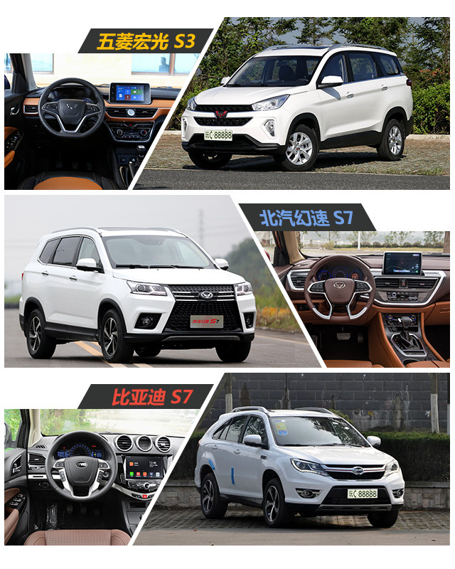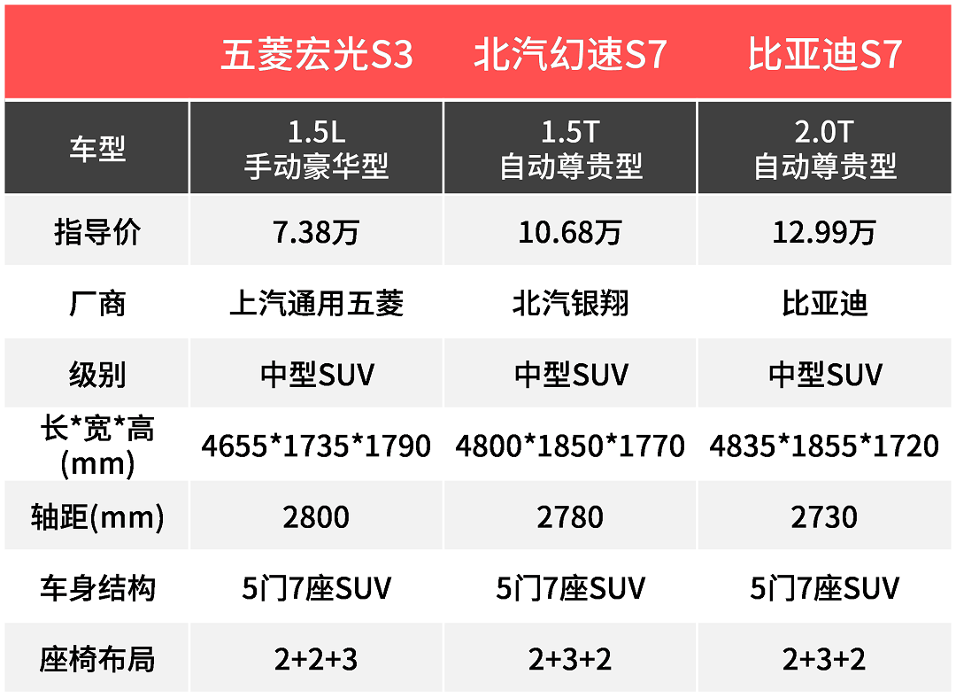 本次推荐车型五菱宏光S3(1.5L手动豪华型)、幻速S7(1.5T自动尊贵型)和比亚迪S7(2.0T自动尊贵型),都是比较多人选择的车型,三款都是中型七座SUV,其中两辆S7都是2+3+2座椅布局,五菱宏光S3则是少见的2+2+3布局。