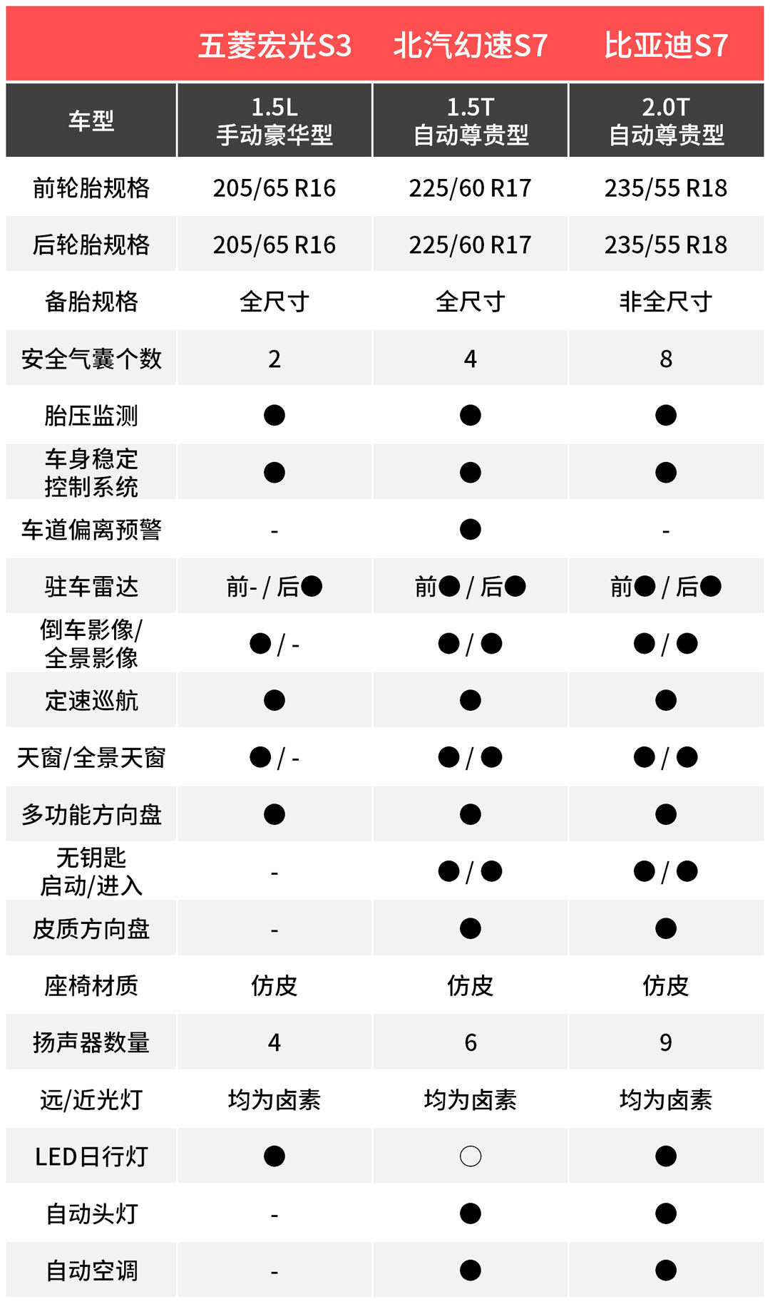 幻速S7就多出一些配置,多了两个气囊、车道偏离预警、全景影像、全景天窗、无钥匙系统等,整体配置高度比五菱宏光S3高出了不少,而且动力更好,日常使用需求能够基本满足。至于比亚迪S7配饰是更上一层楼,气囊增至8个,9个扬声器、氛围灯、防夹手、温度分区控制、空气净化等,舒适配置进一步提升,并且2.0T动力更强,超车提速什么的基本没难度。