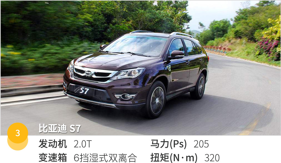 比亚迪S7搭载了自家的1.5T和2.0T发动机,匹配6挡手动和6挡双离合变速箱,推荐的自动尊贵型最大马力205匹,动力足够强劲,在中后段发力都比较足,如果说上一环节空间方面有点劣势,那么这一回合动力方面就补了回来。