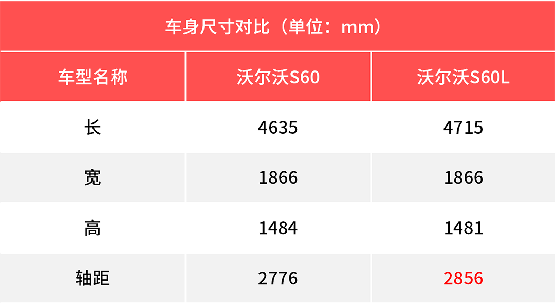 S60L是沃尔沃亚太将S60国产化后的命名,而与这个命名一同到来国内的还有加长了80mm的轴距数值。但加长后的轴距数值放在今天看来并没有太出色,2856mm的数据无论在账面还是在实际空间表现上也只是中规中矩的水平。