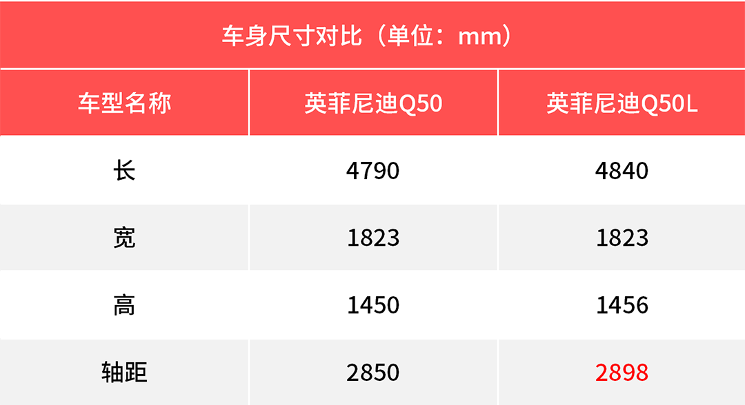 英菲尼迪Q50L在国产后同样经历过加长轴距的工序,但是这个数值却不高,仅48mm。现款2898mm的轴距只能说是已经非常接近2900的门槛了。