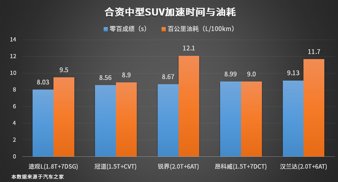 小雅说数据:数据最亮眼的是冠道,1.5T发动机推动重达1.7吨的块头并没有小马拉大车的感觉,做到了动力性与燃油经济性的兼顾;途观L与昂科威次之;锐界动力充足但是油耗偏高;汉兰达开起来最从容,油耗表现也一般。