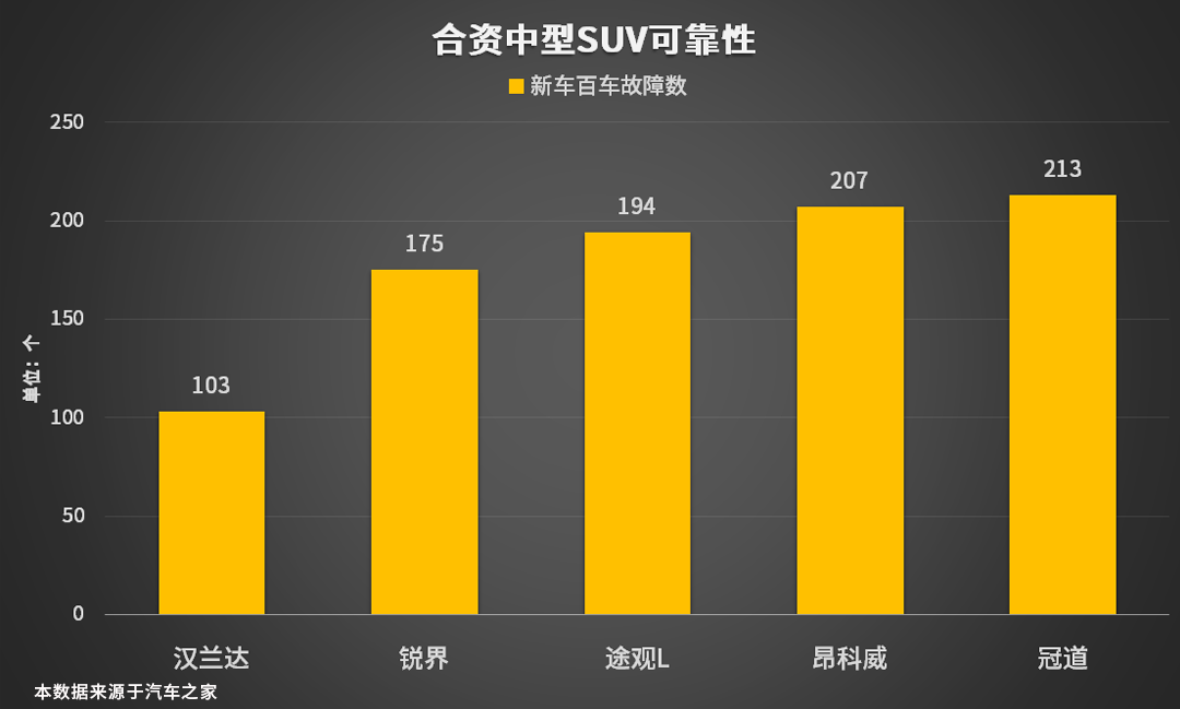 小雅说数据:皮实耐用就是丰田最得意的标签,汉兰达很好地传承了家族基因。别看冠道的百车故障数是汉兰达的一倍,中型SUV这个级别的百车故障数平均值是263,所以冠道也算处于中等偏上水平了。