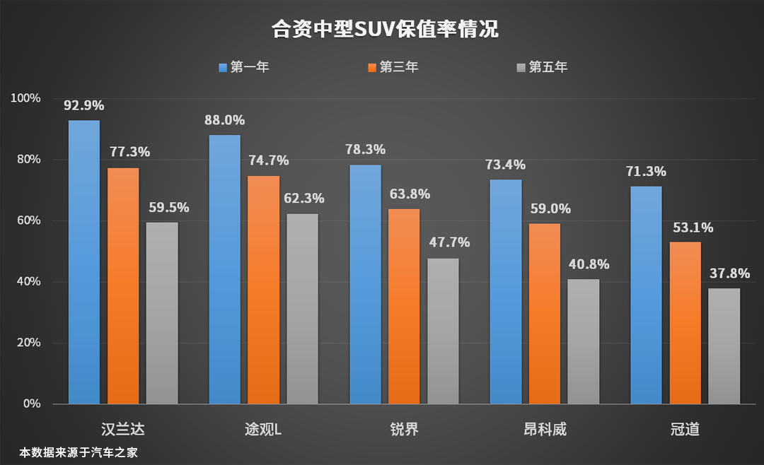 小雅说数据:汉兰达与途观L的保值率非常抢眼,即使到第五年仍有超过50%的保值率,可以看出两车在市场上认可度之高,当然这离不开它们长期积累的良好口碑。