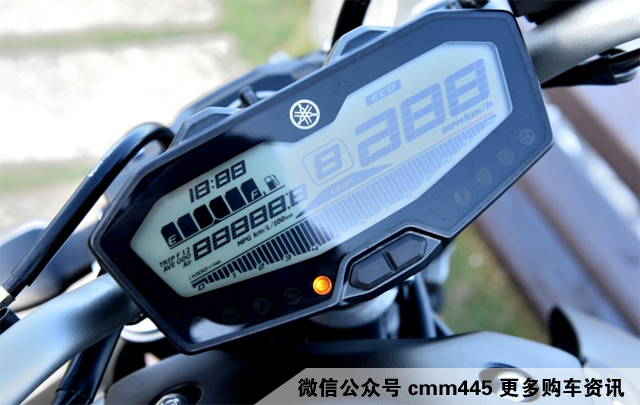 让我们先从MT-07车头配备全液晶显示仪表,感觉显示面板面积不大,实际仪表总成全部资讯显示:时速、里程、转速、油量、警示灯号,应有尽有!正中则有大大的档位表显示,辨识度极高。