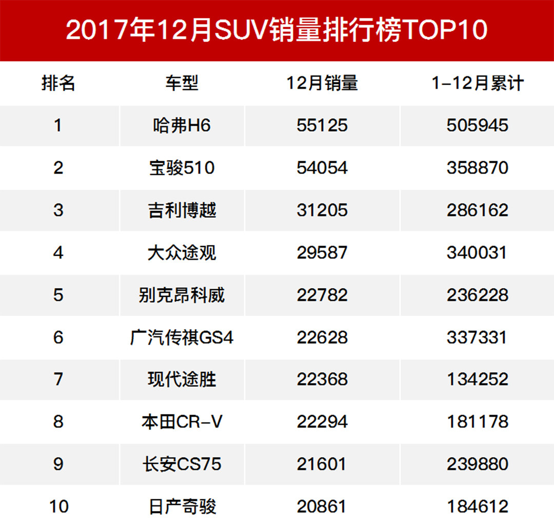 2017年的10月和11月份,SUV销量榜前10中有7款是自主品牌的车型,可是到了12月份,似乎又被合资品牌追成平手,具体战况如何?我们一起来看看。