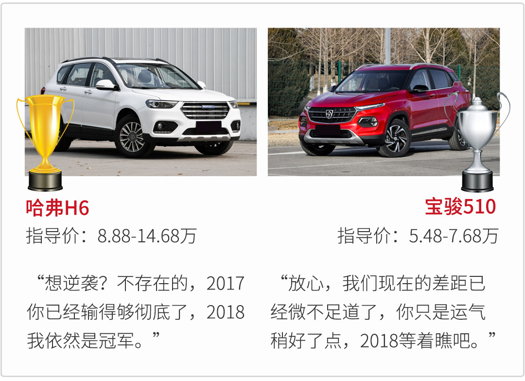 其实在自主品牌与合资品牌的大规模战争中,还有存在这样一个小规模内战,就是2017年竞争得最激烈的哈弗H6和宝骏510,虽然两车不在同一级别上,可是两车的销量却一直饱受关注,并且宝骏510使出吃奶的力气都还是未能舔到月销冠军的金奖杯。