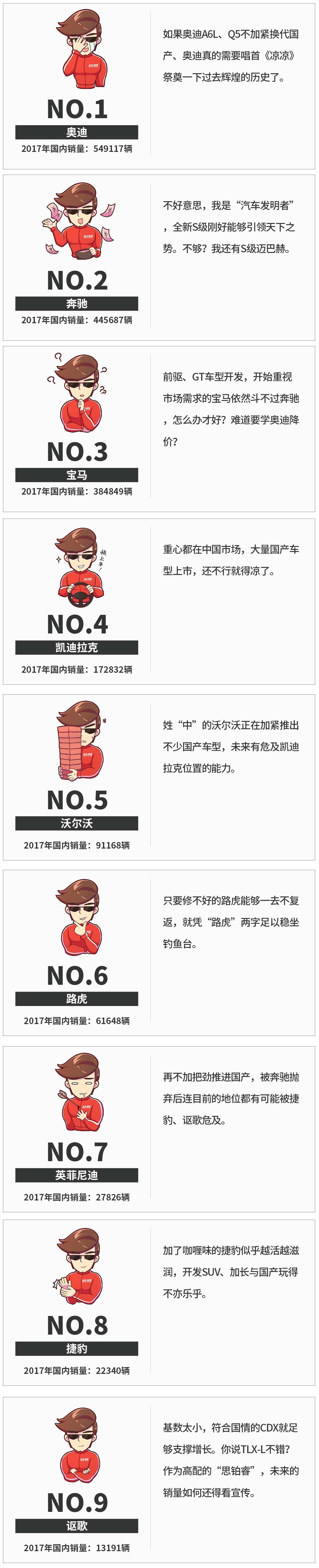 总结:回顾2017年,BBA中一向比较注重中国市场的奥迪最为迟钝,虽然依然保持一定的优势,但奔驰作为汽车发明者”一旦发力实力不容小觑,其中宝马动作更是频繁;换代5系、全新1系与6系GT纷纷亮相。此外,不少二线豪华品牌加紧国产的进程,捷豹XEL与讴歌TLX-L就是临近年末推出市场的两款车型,能否对各自品牌销量有明显的增效,都得看18年进展。