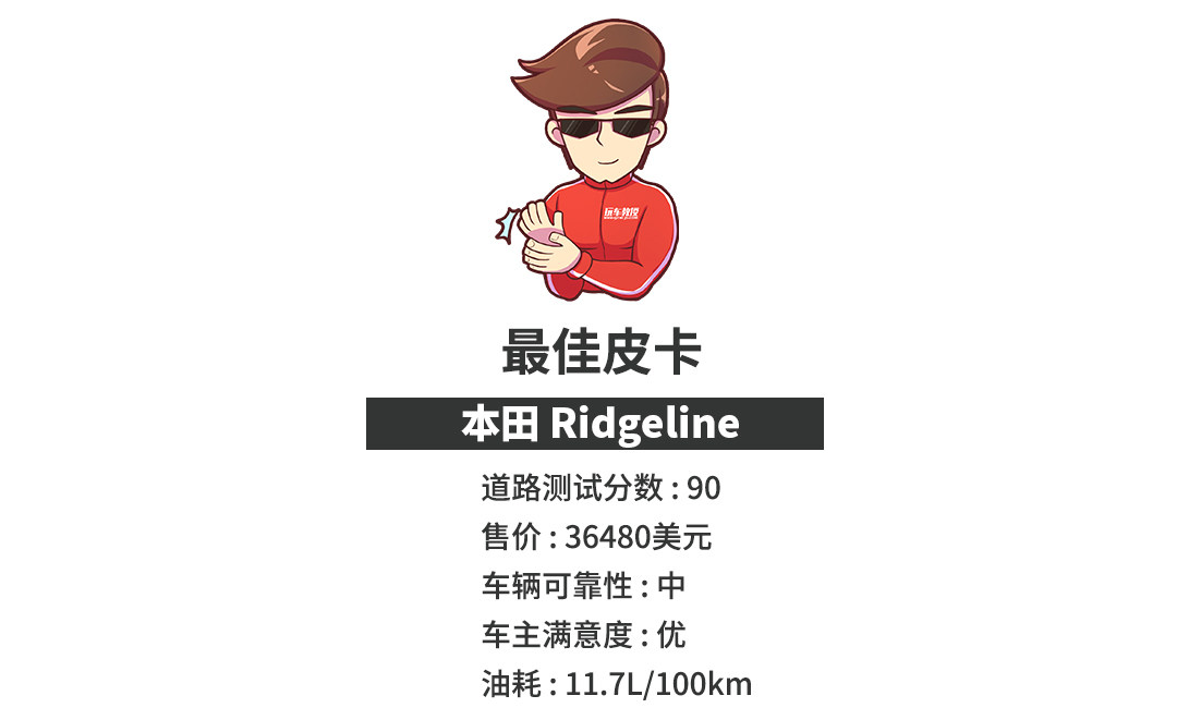 皮卡是美国汽车文化的图腾,辽阔疆土、热爱探索决议了美国人对皮卡的重度热爱。家用接送、拉货载物、越野撒欢,你能想到的汽车用途,皮卡都能帮你实现。杰出的操作功能和车主满意度让本田Ridgeline摘得最佳紧凑型皮卡桂冠。