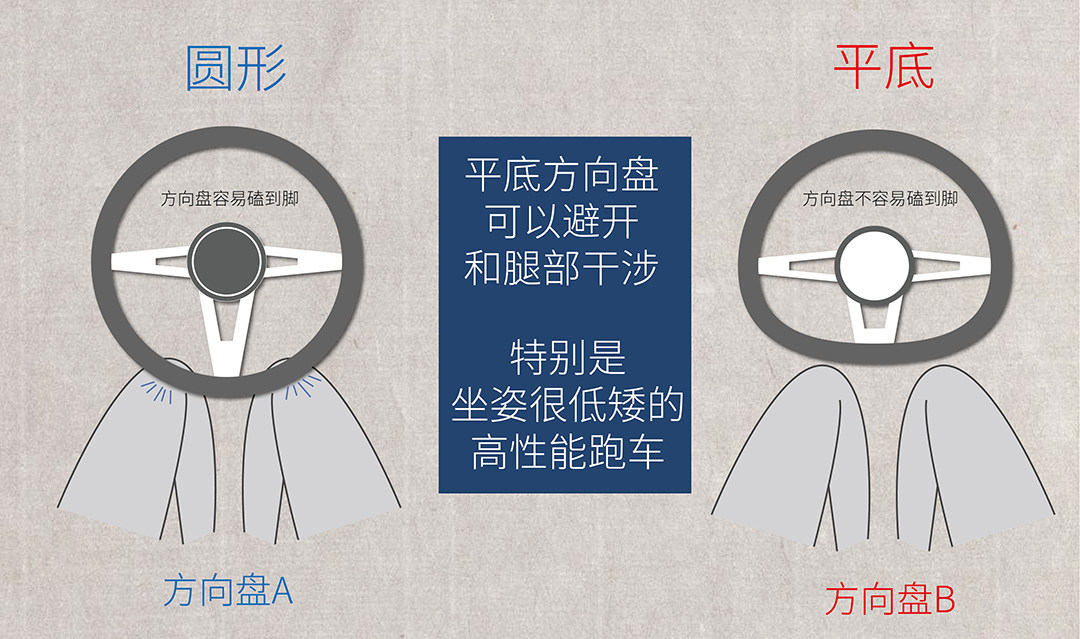 对于像美国这样的国家而言,很多欧洲运动车对于美国人的体型来说内饰都会偏小,因此很容易会出现腿部和方向盘干涉的情况,这时候平底方向盘还是很有使用价值的。