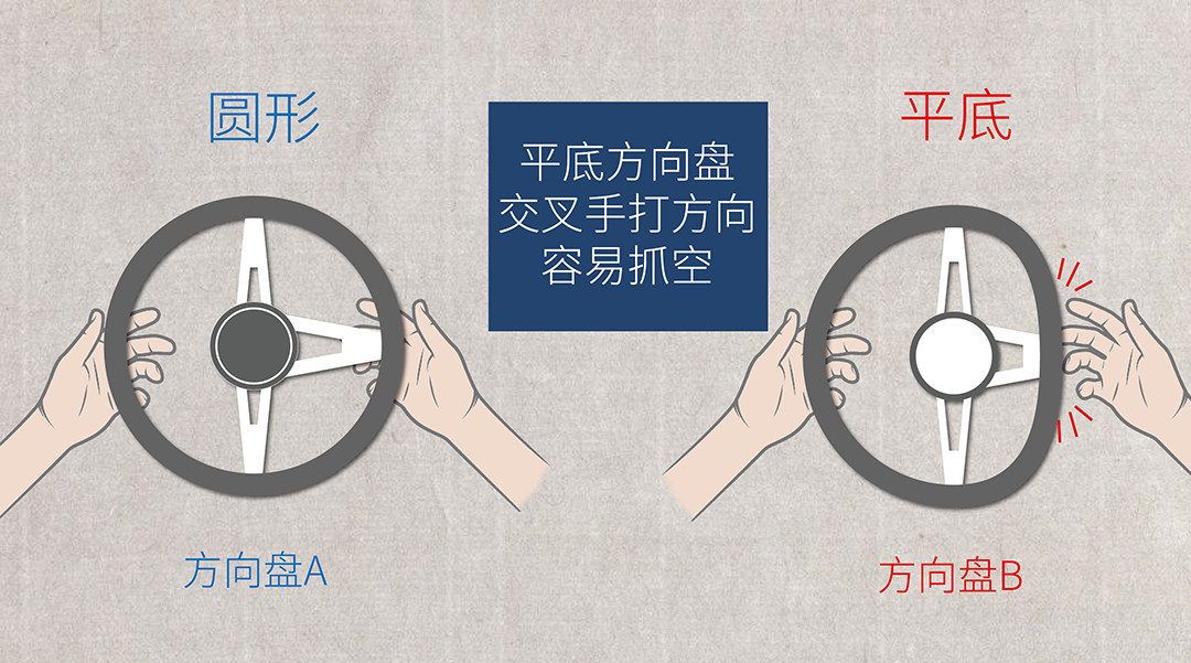 民用车型上的平底方向盘外观都不会像赛车上的那么功能化和极端,还是比较偏向圆形的方向盘,因此平常使用起来也没有特别需要注意的地方。不过当出现大幅度打方向而需要交换手时,会出现抓空的情况,因此现在有不少运动车也依然坚持使用圆形方向盘。当然了,有了平底方向盘 并不代表你的车运动性能更强了。这更多只是一种象征意义而已。