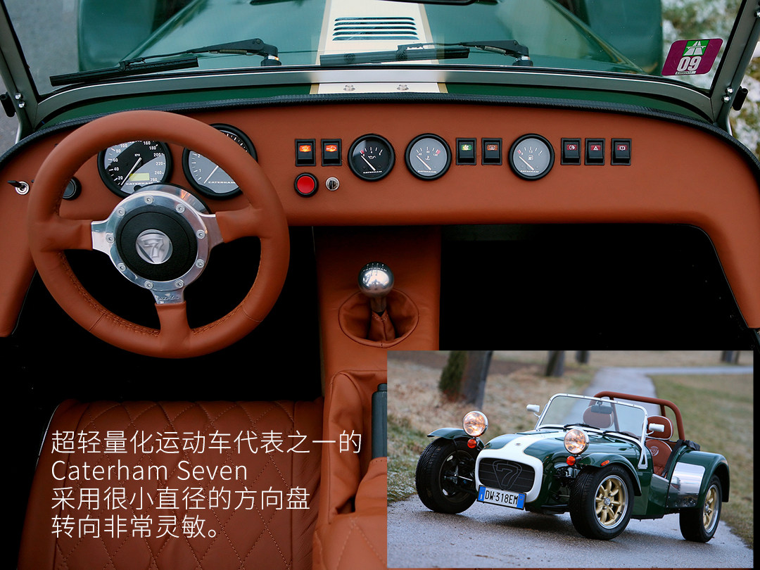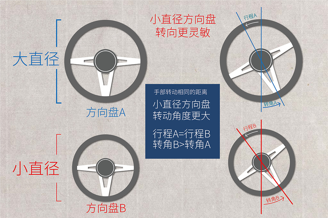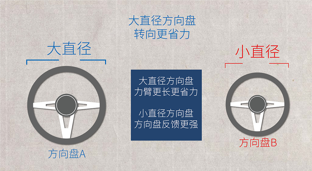 而强调操控性的车型,方向盘就会选择较小的尺寸。和大尺寸方向盘相反,小直径的方向盘手感会更扎实,方向反馈更好。打方向时手部移动相同的轨迹方向盘转角也会更大(线速度相同,小直径圆的角速度更高),因此转向反应会更快一些。