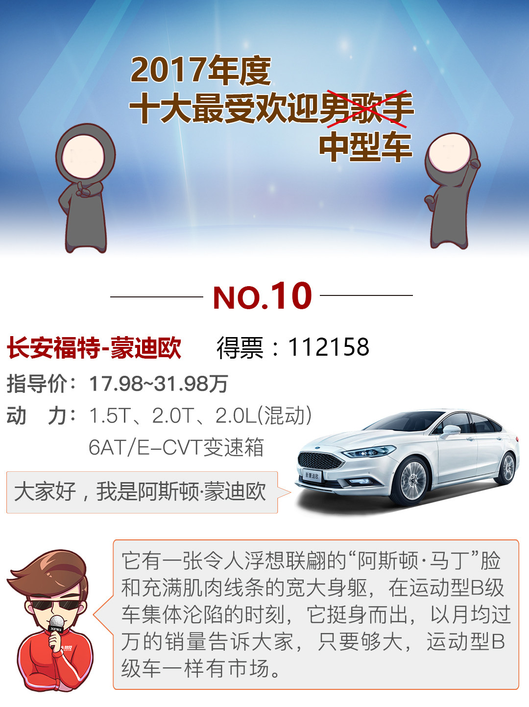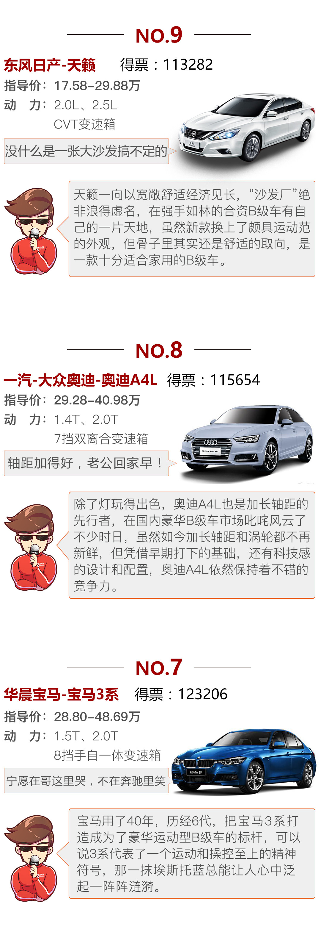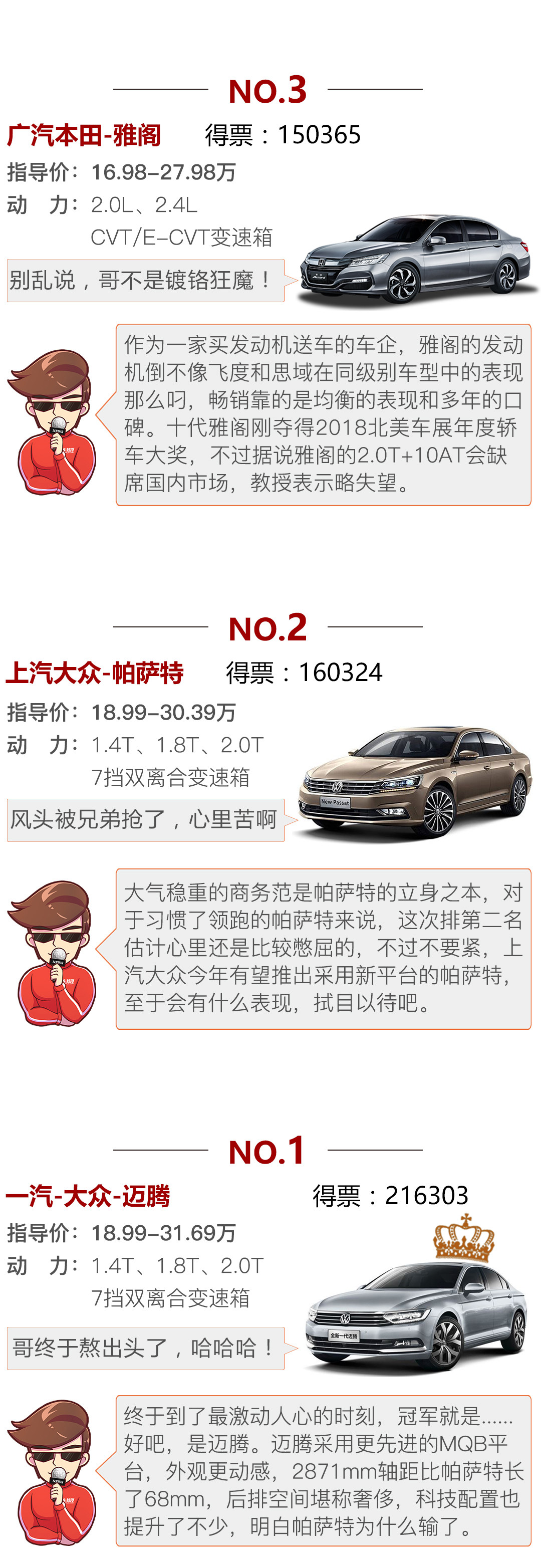由于太沉迷工作,教授都没留意到春节的脚步已经越来越近了,直到看到大大小小的颁奖典礼,才想起了我们也该进行颁奖了。现在年轻人越来越有钱了,中型车也越来越受欢迎,今天就评选出2017年度最受欢迎男歌手,啊呸,2017年度最受欢迎中型车,经过紧锣密鼓的统计,名单已经在我手上了。这次评选全部是由用户投票的,而且投票的成本还不低,最少也得差不多二十万才能投票,所以结果绝对公平公正,得奖的车型也是实至名归,好了,现在开始公布得奖车型。