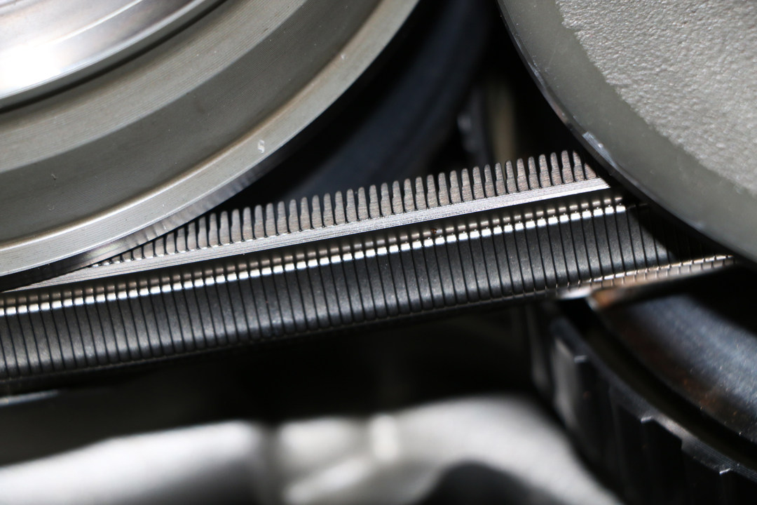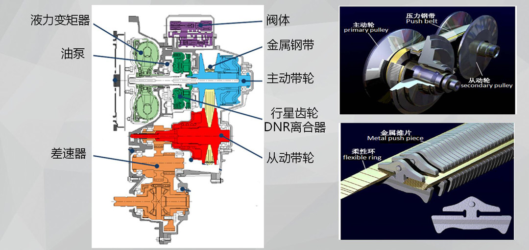 CVT变速箱的核心机构如上图所示,主要通过钢带传动(由博世提供),一共有443片组成,每片之间相隔1.4-1.5mm,通过钢片之间互相挤压传动。通过两边锥轮改变钢带在主动锥轮和从动锥轮的旋转半径,以达到变速的效果。