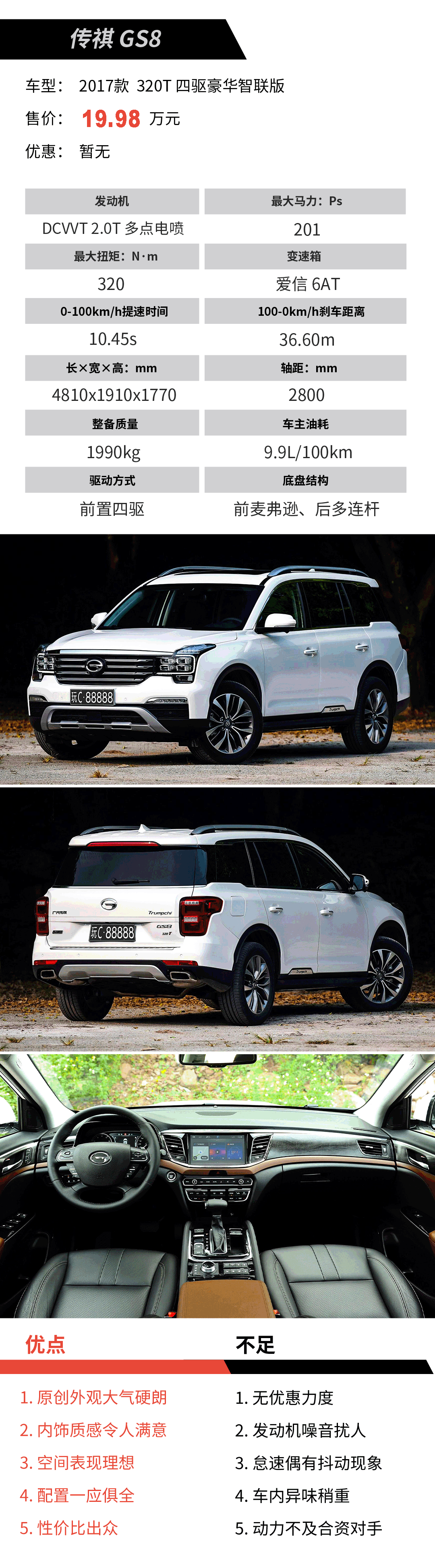 凌云翼进气格栅、矩阵式LED大灯、8字型尾灯,大气硬朗的GS8浑身散发着原创气息。用料精良、做工用心的内饰不输合资对手,只是恼人的异味及发动机噪音令人不满。整车尺寸虽大,第三排空间却只宜应急不适合久坐;四驱系统能轻松应对郊外路况,却不适合高强度越野。不妨把它看作是外观硬朗、内心柔软的居家男。