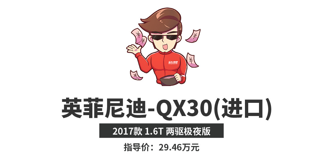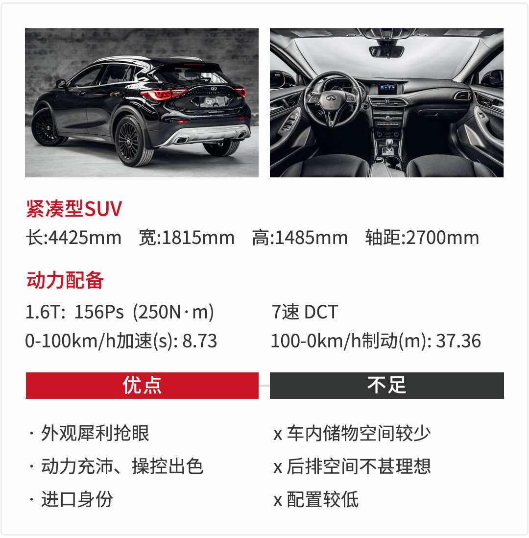 凌厉的线条、独特的车身姿态将冲突美学设计理念彰显无疑;诞生于英国日产工厂、与GLA共同来自奔驰MFA平台,QX30身份可不凡。动力充沛的1.6T发动机搭配降挡不积极的7速双离合,实际表现还算理想。只是不算亲民的售价、较低的品牌认知度、偏低的配置水平以及不享受四年免费保养,令其在同级中并无太大竞争力。