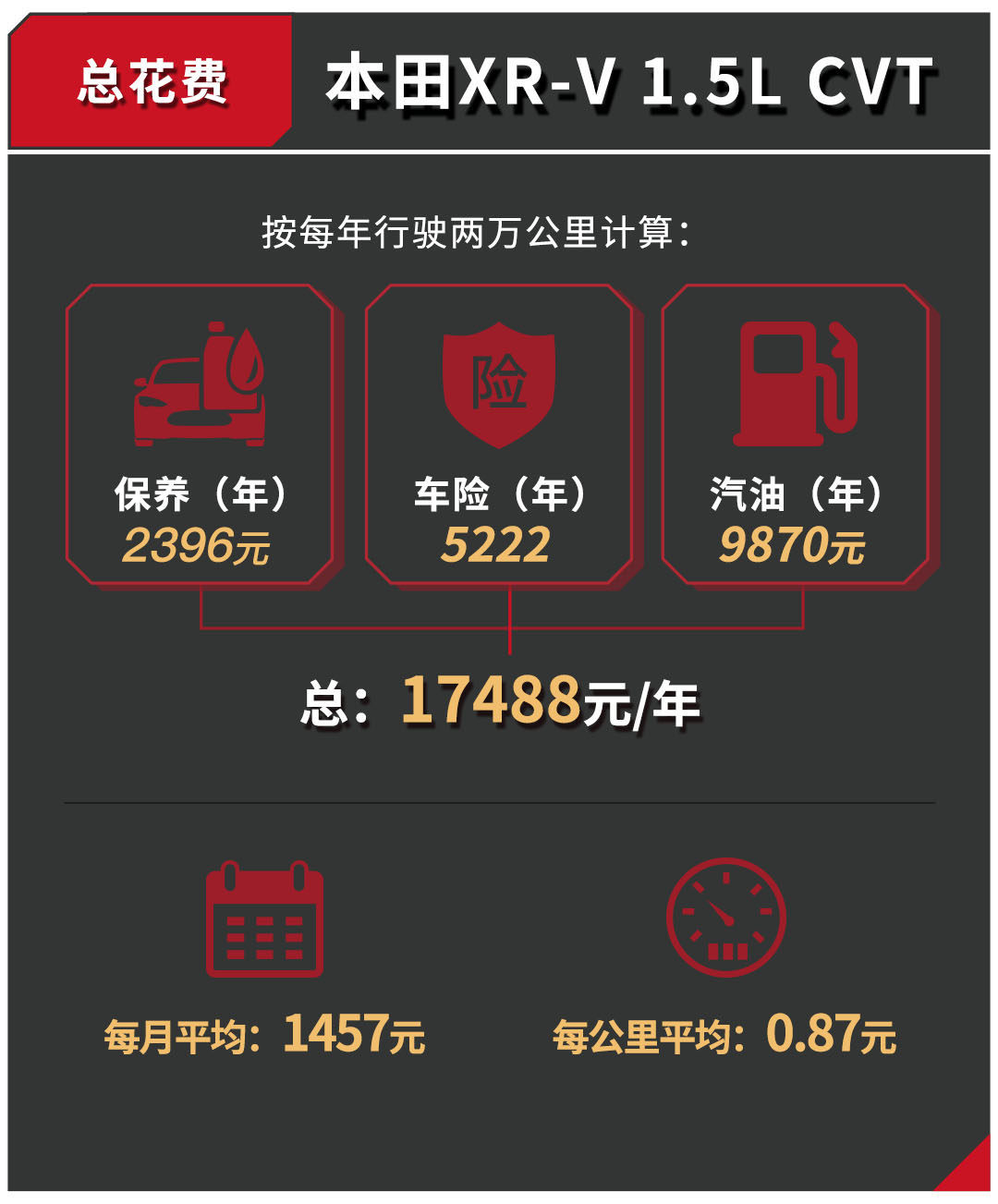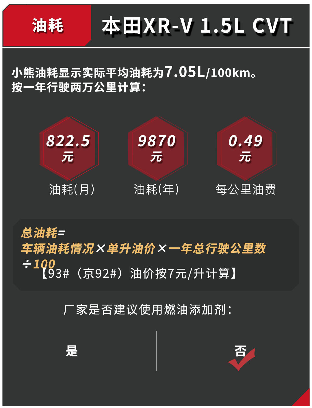 小结:本田XR-V一向以低油耗取胜,1.5L车型表现得最好,而且地球梦发动机同样不俗的动力输出,如果不是在每次保养时需要添加喷油嘴清洁液,后期成本还能进一步压缩。