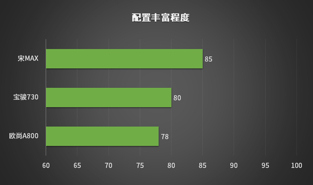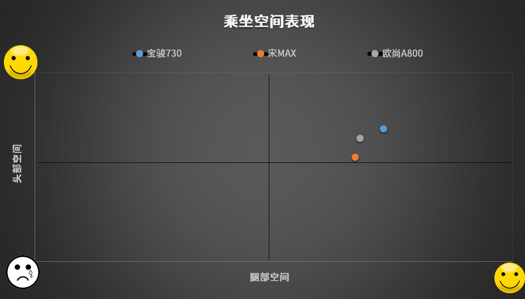 宝骏730的二、三排都拥有令人满意的腿部及头部空间,而宋MAX第三排的腿部空间一般,并且头部空间略显局促,欧尚A800的表现则处于两者之间。但总体而言,三车都能满足一般的家用需求。