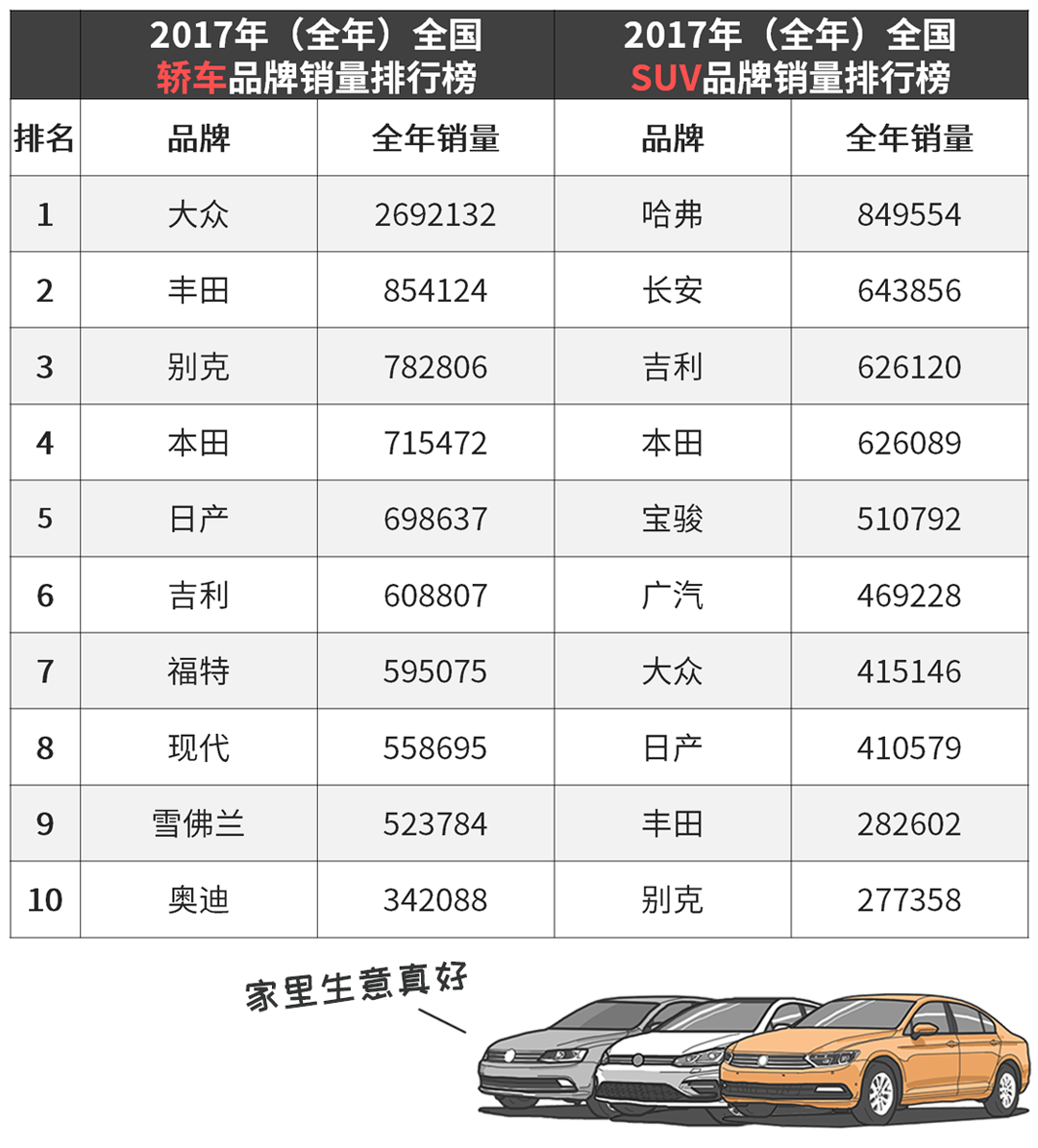 如果问:在2017年里,哪一个品牌是大赢家?那肯定是大众!光是在轿车方面,他们在去年就卖了2692132辆,即使只是SUV也卖了415146辆,简直就是卖疯了。