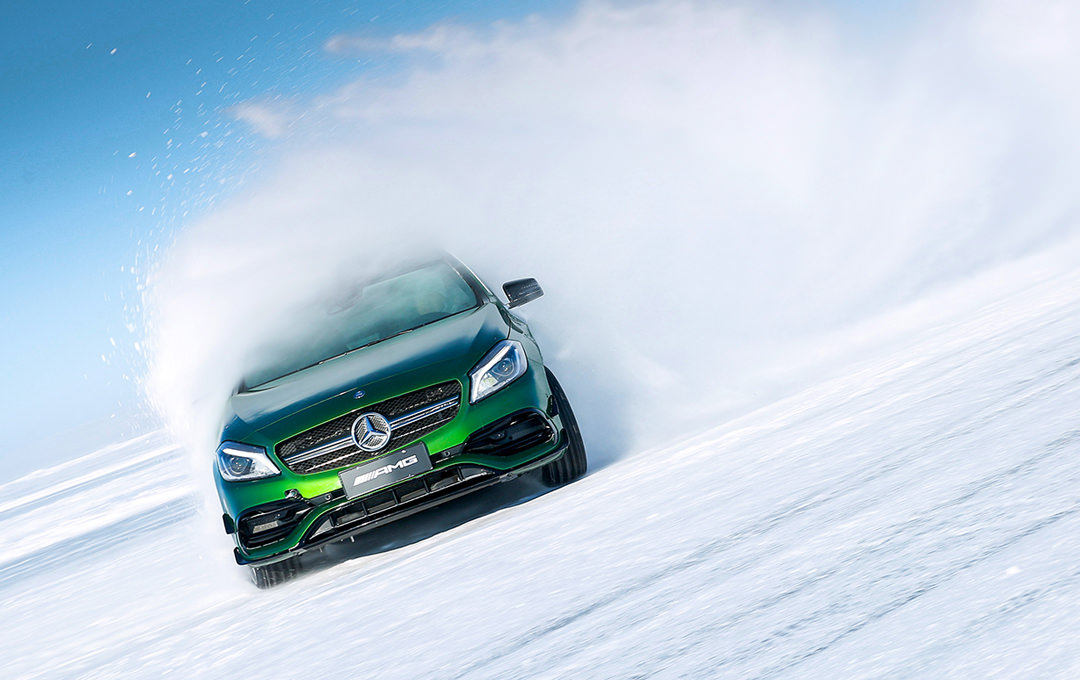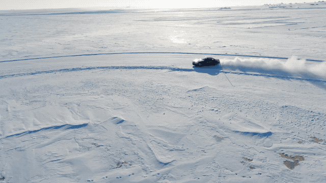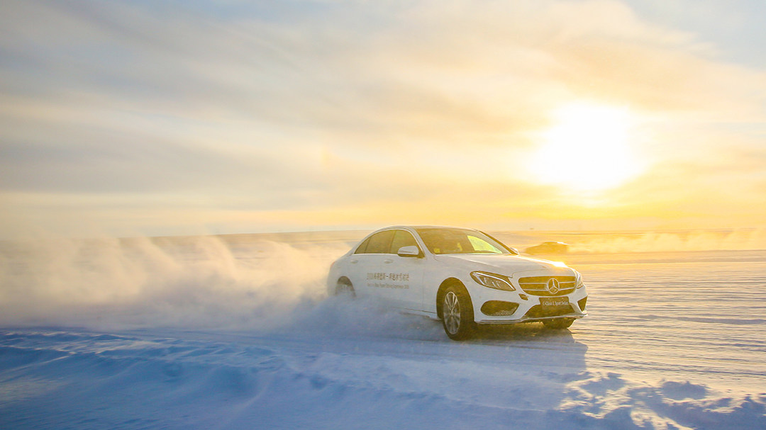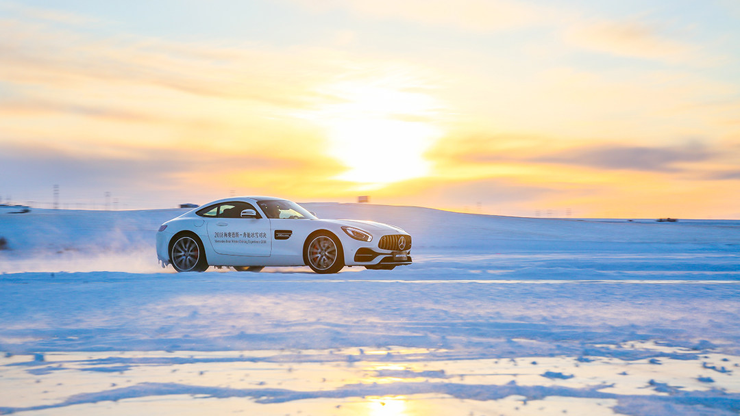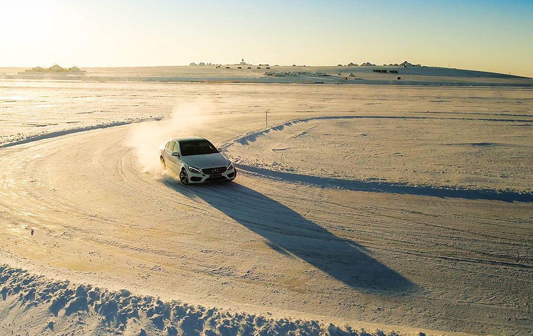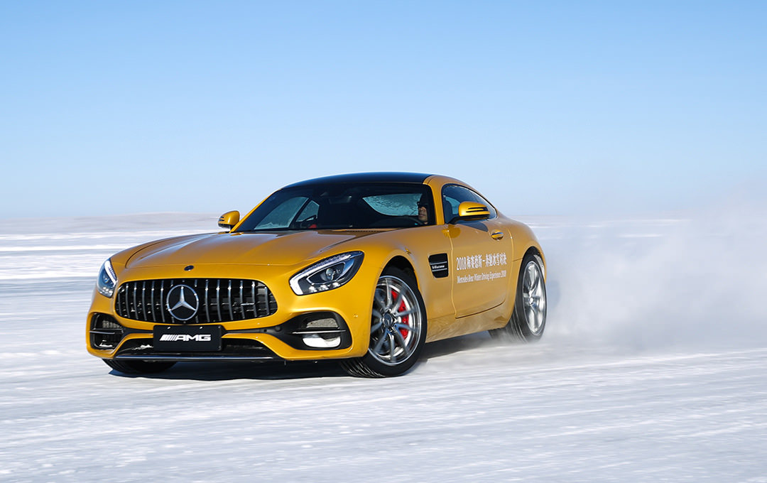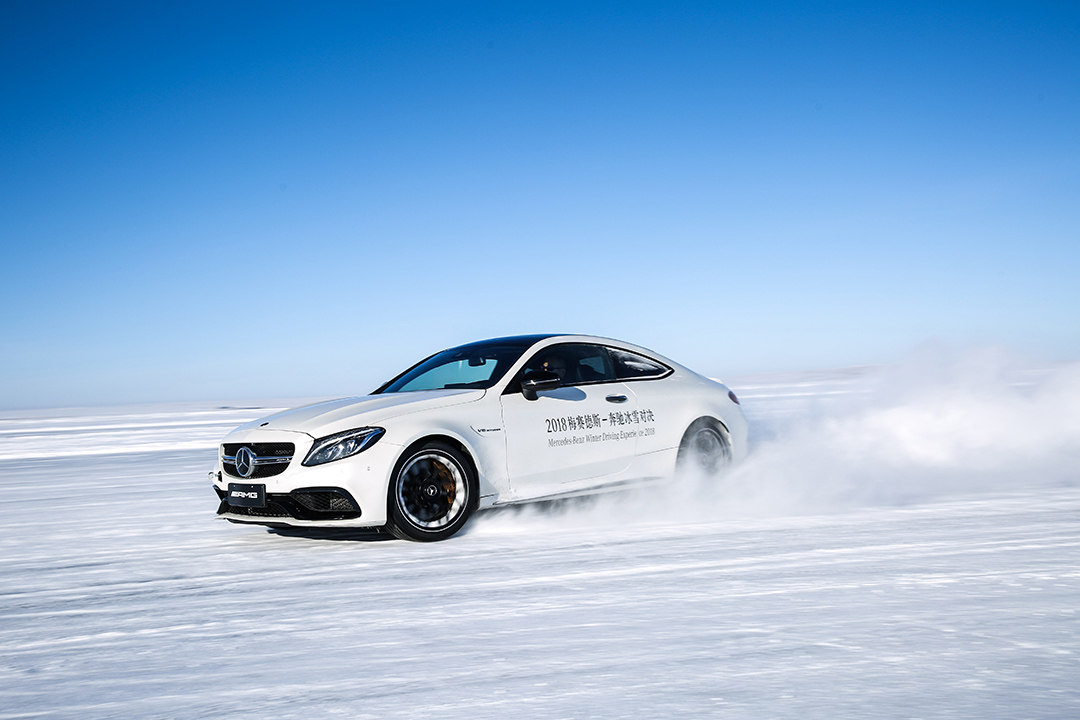 所谓扭力对抗,就是非常简单粗暴地采用强大的动力输出,直接让车轮空转打滑,突破抓地力。然而冰雪湖面上,压根就用不着奔驰AMG GT或者奔驰AMG C63这样动力猛兽来表演,一辆普通的C200 coupe都能轻易突破抓地力。