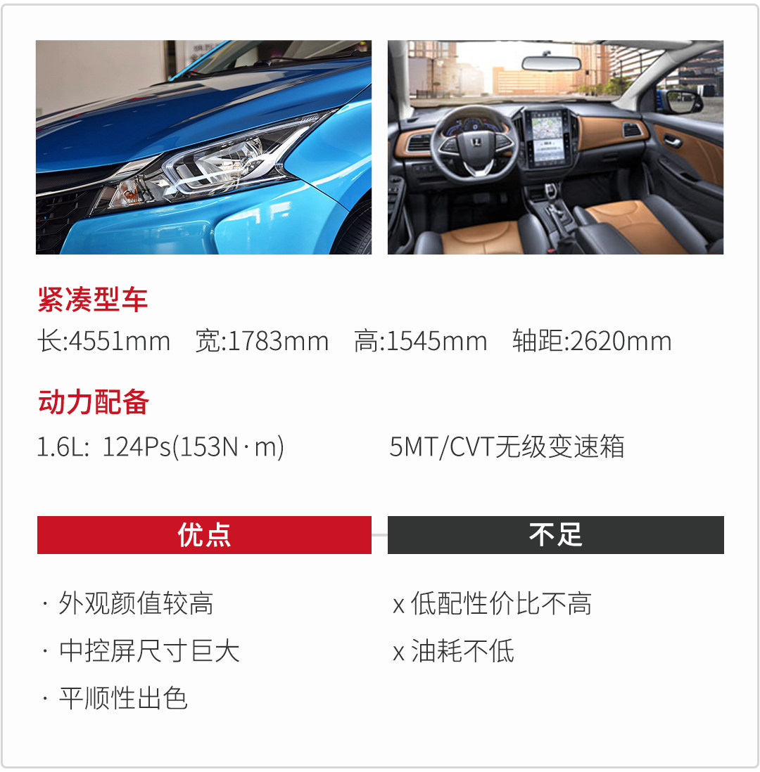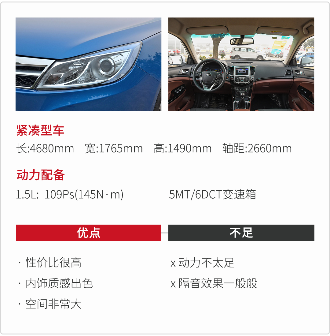 纳智捷锐3的外形设计在自主车型当中有着非常高的原创度,而且颜值都很高,车灯别具一格,精神、帅气,内饰也跟得上潮流,特别仪表盘,蓝白红搭配的数字模拟显示很有科技感,全系搭载1.6L自吸发动机,匹配5挡手动和CVT变速箱,自动挡车型起步价7.88万,价格跟比亚迪速锐差不多,同样10万就能落地,顶配十万不到。