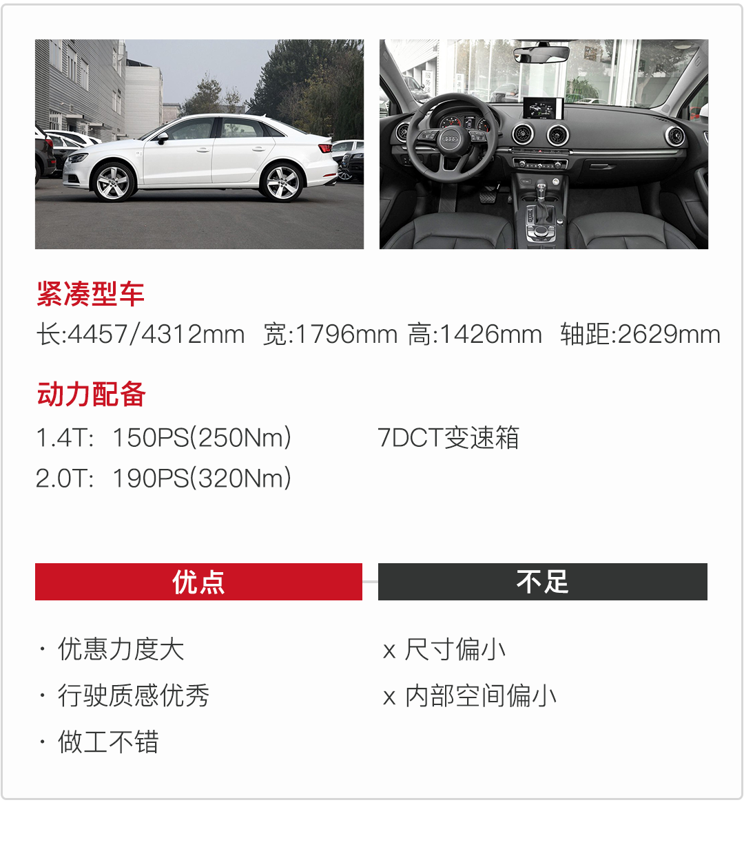 不过细想下来,其实也并不奇怪,虽然说它的尺寸比较小,但是它的外观设计却有着自家大哥奥迪A6L的感觉。六边形的前格栅、大灯的造型、侧面的线条都和奥迪A6L比较相似,大量平直线的运用也使得A3在视觉效果上并不显得那么小。而在车内的做工上A3也是保持了奥迪一贯的高水准。但是A3最大的杀手锏还是驾驶感受。虽然是奥迪家族最小的三厢轿车,但是A3却有着奥迪车型非常出色的高速稳定性以及机械精密感,这是许多同价位的中型轿车做不到的,如果你非常注重质感的话,那么A3真的值得选。